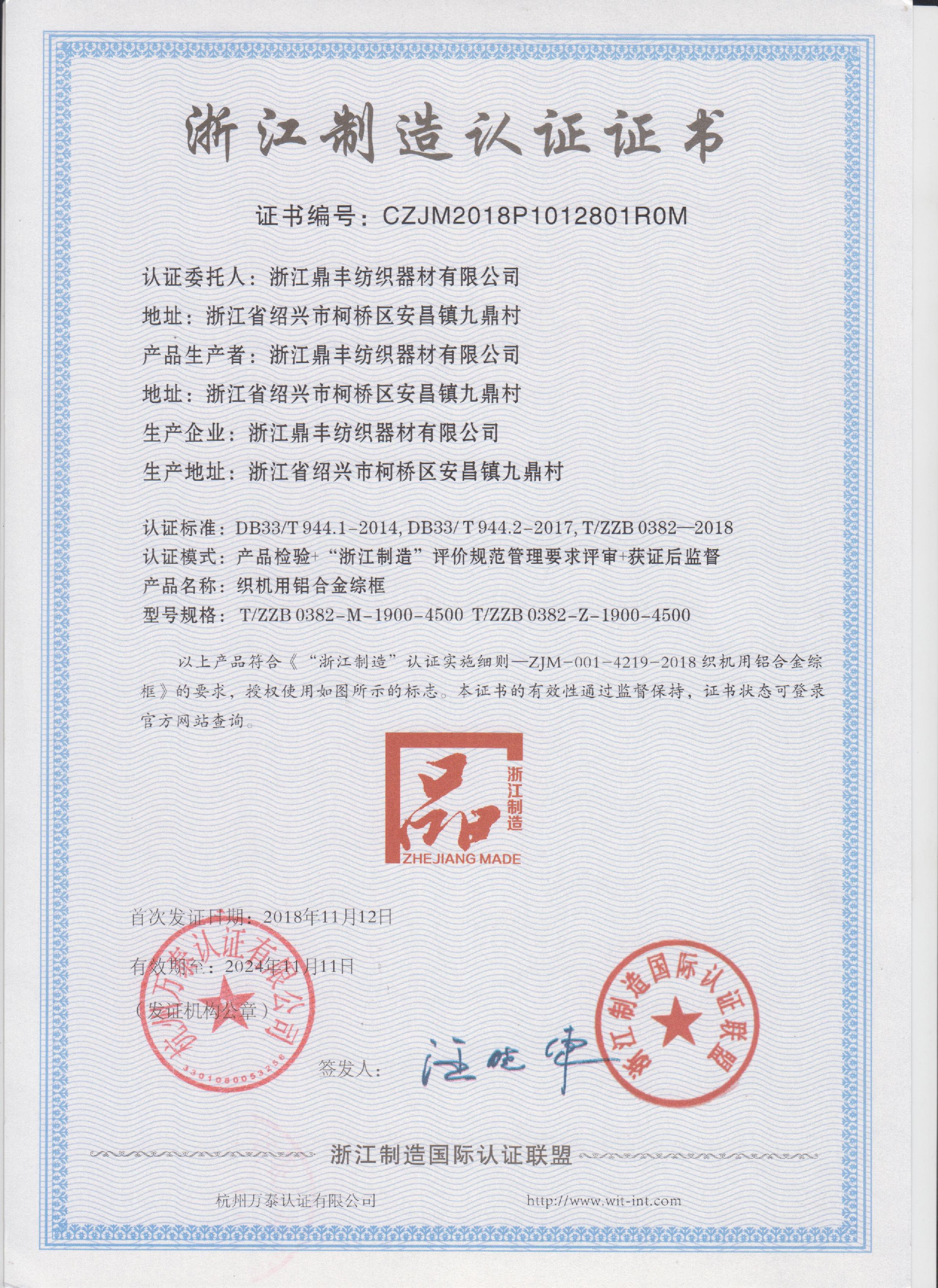 公司現(xiàn)有固定資產(chǎn)6000余萬元,員工300余人,現(xiàn)具有年產(chǎn)噴氣異型筘12萬米,劍桿筘32萬米,噴水筘5萬米,綜框20萬片,鋼片綜2億片,停經(jīng)片1.5億片, 織軸1.2萬套的生產(chǎn)能力。公司“越泉”商標被評為“中國馳名商標”。公司通過ISO9001 :2015國際質量體系認證,ISO14001:2015國際環(huán)境管理體系認證,ISO45001:2018國際職業(yè)健康安全管理體系認證,噴氣織機用鋼筘和織機用鋁合金綜框獲得“浙江制造”品牌認證,公司擁有自營進出口權,產(chǎn)品暢銷全國并遠銷印度、巴基斯坦、土耳其、埃及、哥倫比亞、意大利等國家和地區(qū)。